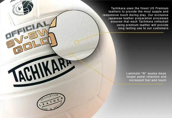 Taking high school competition play to the next level, the Tachikara SV5W Gold Volleyball is approved for high school game play by the NHFS. This ball features an upgraded, patented dual bladder construction, and a premium leather cover for better performance and control during game play. You'll see and feel the difference with each serve, kill and dig.